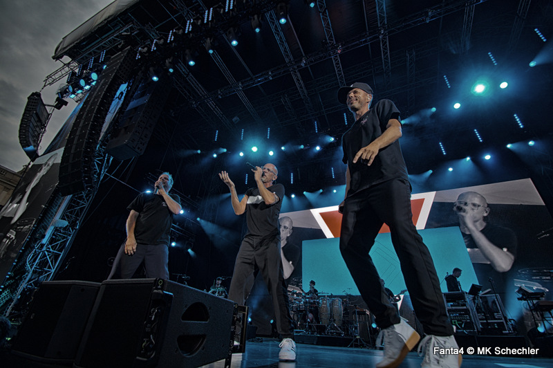 Den Schlusspunkt beim diesjährigen, überaus erfolgreichen Jazzopen-Festival setzen Die Fantastischen Vier. Und zwar ein Punkt mit Ausrufezeichen. Alle Songtexte sind den Fans bekannt, es wird gesungen, getanzt, mitgehüpft und gefeiert. 7000 Fans sind es auch hier, lange vorher ausverkauft, die Fanta4 sehen wollen. Und sie werden nicht enttäuscht…Picknicker (im Business-Bereich gibt es Catering) und Kopfnicker, Hip Hop steckt sie alle an. Man sieht Smudo mit Trompete, davor stimmt die JAZZKANTINE auf den Abend ein. Natürlich sind einige Stücke aus dem im Februar Im Wizemann vorgestellten neuen Album “Captain Fantastic” dabei, aber auch viele Hits der vergangenen fünfundzwanzig Jahre finden sich auf der Setlist. Auch wenn alle zu den letzten Stücken wie dem aktuellen Hit “Zusammen” richtig nass werden, der Besuch bei den Fanta4 hat sich allemal gelohnt. Klasse Konzert, Klasse Festival!