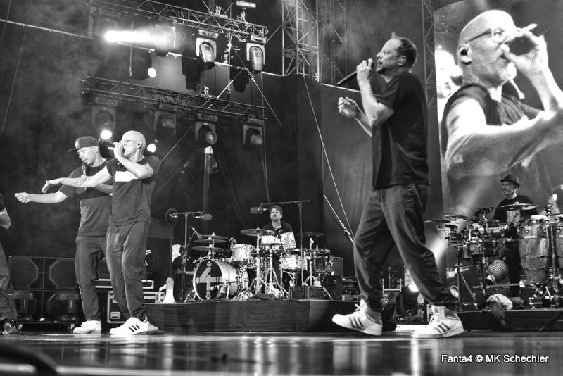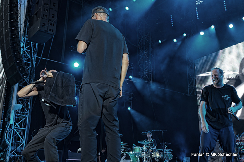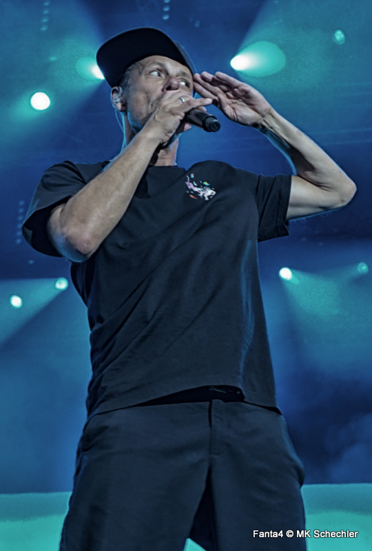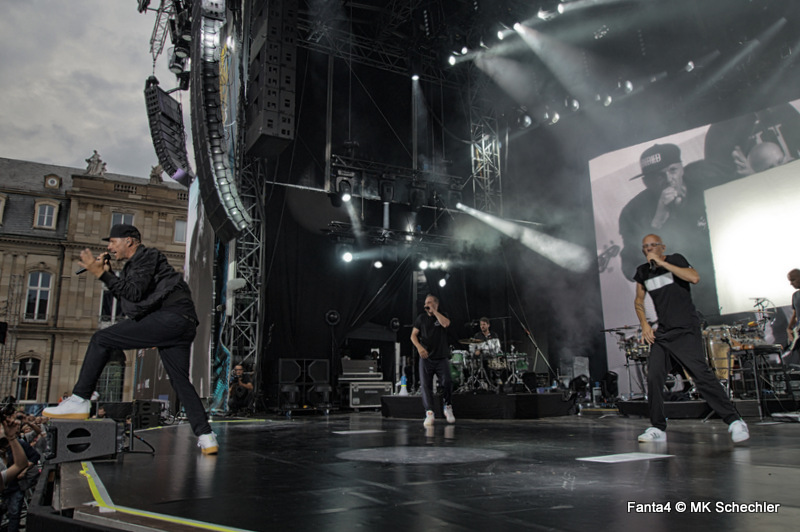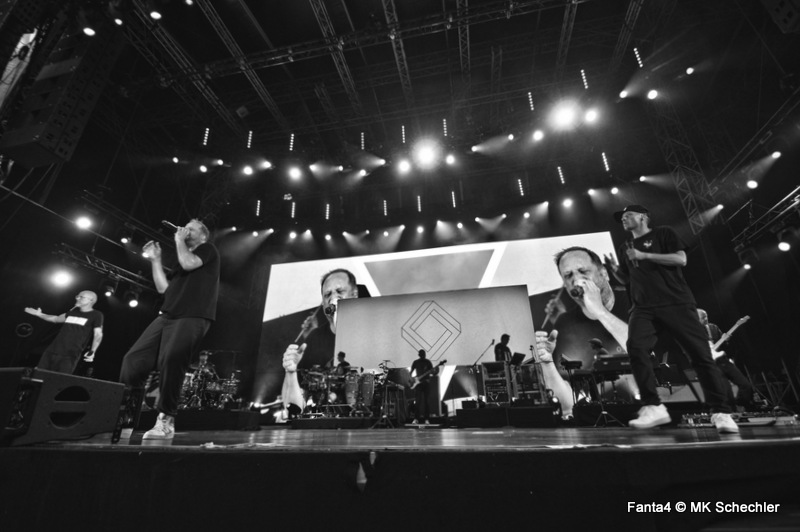 Den Schlusspunkt beim diesjährigen, überaus erfolgreichen Jazzopen-Festival setzen Die Fantastischen Vier. Und zwar ein Punkt mit Ausrufezeichen. Alle Songtexte sind den Fans bekannt, es wird gesungen, getanzt, mitgehüpft und gefeiert. 7000 Fans sind es auch hier, lange vorher ausverkauft, die Fanta4 sehen wollen. Und sie werden nicht enttäuscht…Picknicker (im Business-Bereich gibt es Catering) und Kopfnicker, Hip Hop steckt sie alle an. Man sieht Smudo mit Trompete, davor stimmt die JAZZKANTINE auf den Abend ein. Natürlich sind einige Stücke aus dem im Februar Im Wizemann vorgestellten neuen Album “Captain Fantastic” dabei, aber auch viele Hits der vergangenen fünfundzwanzig Jahre finden sich auf der Setlist. Auch wenn alle zu den letzten Stücken wie dem aktuellen Hit “Zusammen” richtig nass werden, der Besuch bei den Fanta4 hat sich allemal gelohnt. Klasse Konzert, Klasse Festival!