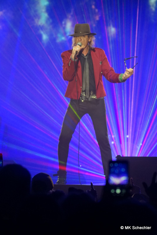Gleich vorweg – bei Udo ist es wie bei gutem Wein: Je älter, je besser! Was dieser Mann in seiner etwa dreistündigen Show hier in der Stuttgarter Schleyerhalle alles auf die Beine stellt ist großartig, bombastisch. Der inzwischen Dreiundsiebzigjährige bewegt sich behände zwischen Band, Background-Sängern oder tanzenden Frauen-Formationen, die mal futuristisch, mal als Nonnen mit anschließendem Aha-Effekt auftauchen. Immer schwingt eine Botschaft zu aktuellen Themen mit, anstatt Kriege sollten die Mächtigen die Kämpfe persönlich im Boxring austragen – prompt stehen Trump und Putin mit übergroßen Köpfen auf der Bühne. Menschlichkeit, Natur sind weitere angesprochene Themen.Nach “Woody Wodka” zu Beginn folgen “Honky Tonky Show”, “Mein Ding” gleich Titel, die die Fans von Anfang bis Ende mitsingen – und das ist erst der Anfang. Nach zwanzig Titeln kommt der erste Zugabenblock, es wird nicht der einzige bleiben. Auf insgesamt zweiunddreißig Titeln kommen wir am Schluss. Klasse auch der Auftritt des langjährigen Weggefährten und WG-Mitbewohner OTTO, zusammen intonieren sie nicht nur “Friesenjung”, sondern auch den eingedeutschten AC/DC Titel “Heimweg wird’s Hell” – klasse. Da wo Udo Lindenberg draufsteht ist auch Udo Lindenberg drin und das hundertprozentig!