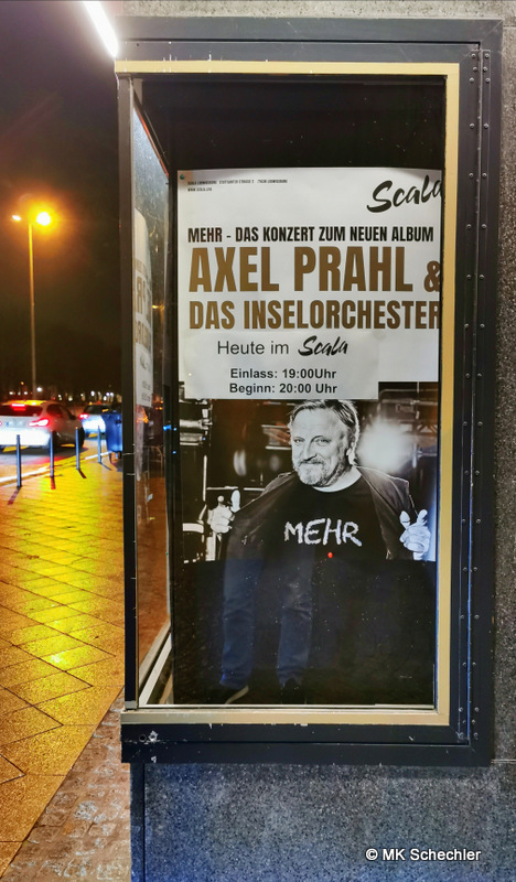 Im Herbst 2018 folgte das zweite Album “MEHR” mit dem Axel Prahl nun hier auftritt. Es beginnt das Inselorchester mit einem Intro bevor Axel Prahl die Bühne betritt und mit einem Shanty erstmal für Stimmung sorgt. Es folgen weitere eigene Lieder, mal heiter beschwinglich oder nachdenklich. Thema oft der Norden, die Seemänner und das Meer.