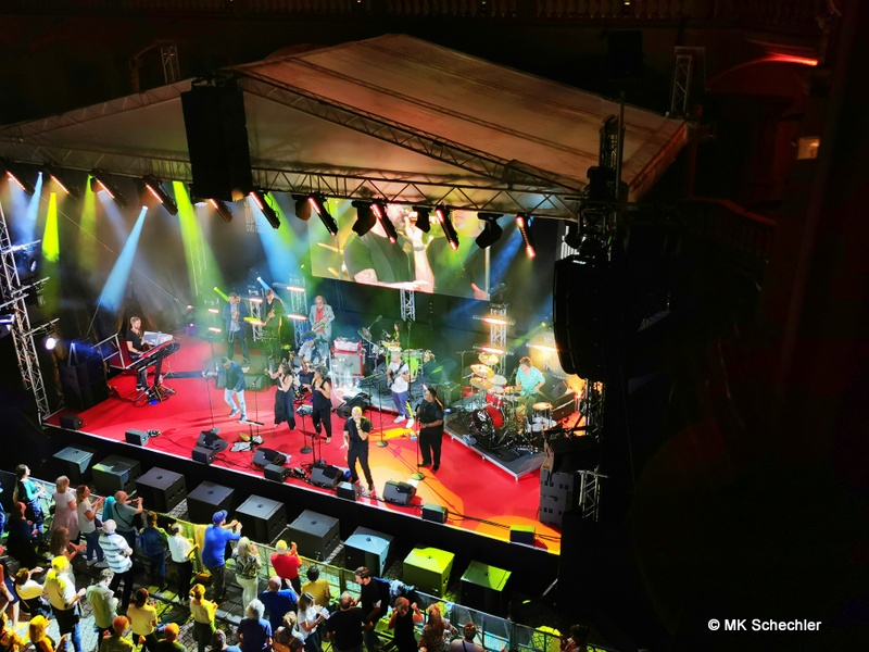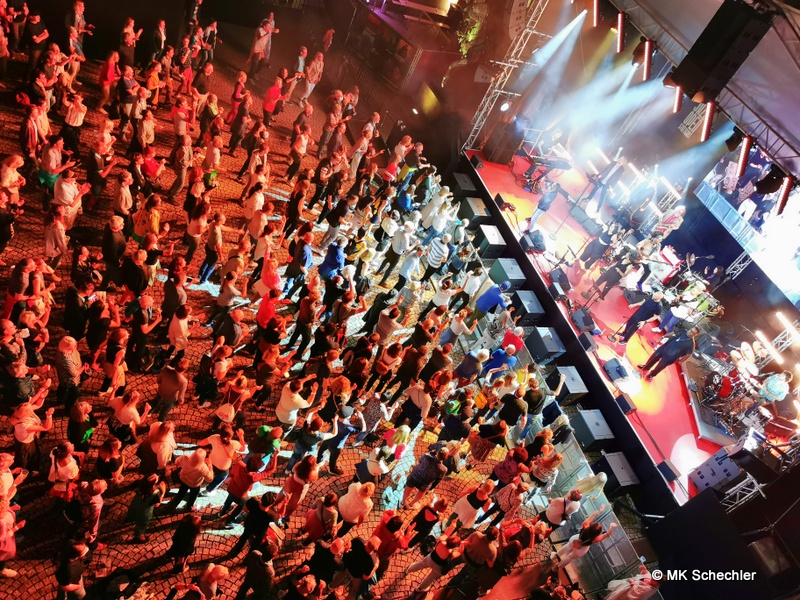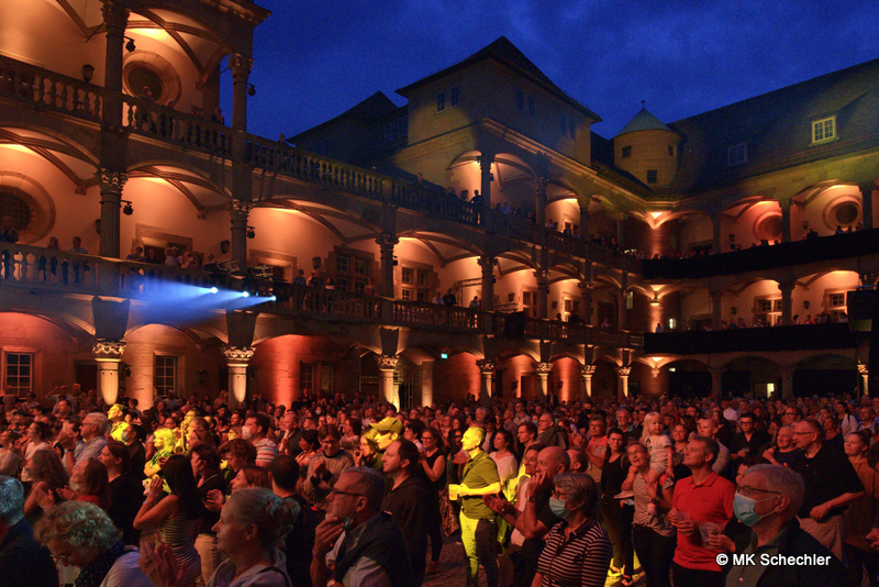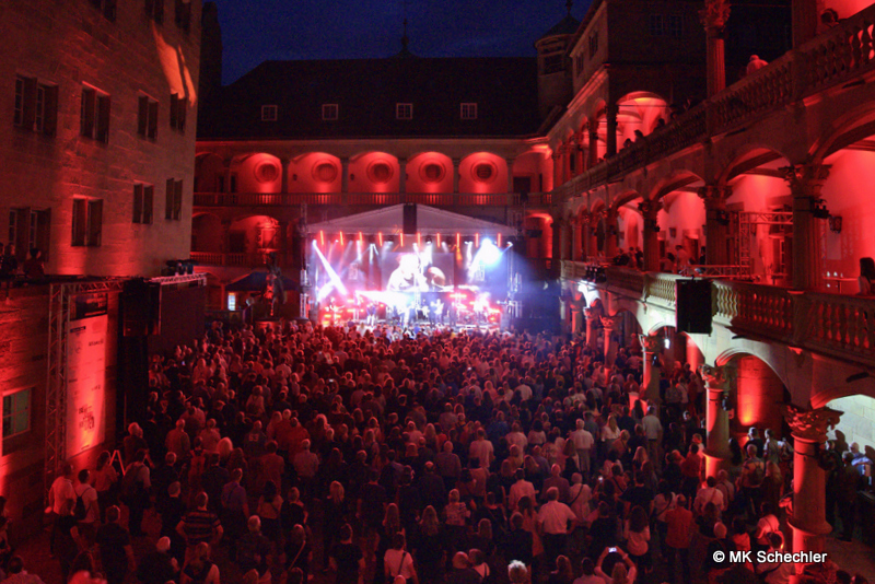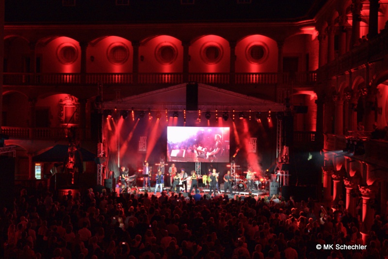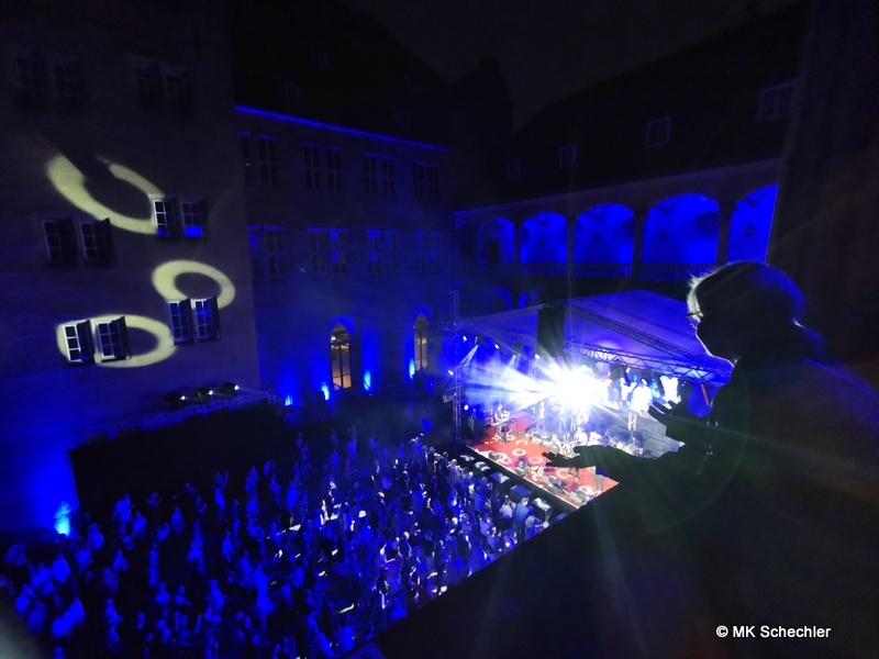 Mit knapp 1000 Besuchern ist das Konzert nicht ganz ausgebucht, die Gäste können sich locker im Hof des Alten Schlosses verteilen. Die Emporen des historischen Gemäuers werden mit zunehmender Dunkelheit durch die Beleuchtungseffekte immer atemberaubender und vermitteln eine Open Air Club-Atmosphäre.