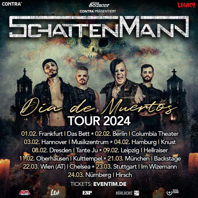 Im Februar 2024 gehen SCHATTENMANN auf große „Día de Muertos“ Tour. Die Tour passend zum gleichnamigen Album führt das Quartett um Sänger Frank Herzig durch ganz Deutschland und Österreich. Von Hamburg bis München, von Berlin bis Wien wird die Band Abend für Abend ihre fabelhaften Live-Qualitäten unter Beweis stellen. Denn auf der Bühne fühlen sich Herzig & Co. am wohlsten: „Wir machen Musik, um zu entertainen, Schattenmann-Shows sind pures Entertainment! Bei uns wird gelacht, geweint, getanzt, geschwitzt, also all das, wofür moderner Metal steht!“
