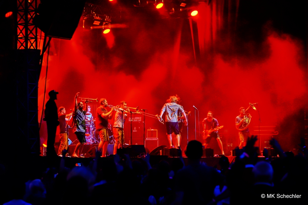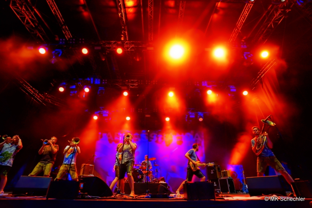 Das Brasstival öffnet am Nachmittag mit den regionalen Formationen Musikverein Ossweil und Spicy Root aus Schwieberdingen. Mit Druckluft und Folkshilfe erhöht sich die Frequenz und gipfelt am späten Abend mit dem Auftritt von La Brass Banda. Der neue Hype um Blasmusik zeigt sich deutlich an den Reaktionen der etwa 3.500 Zuschauer. Keine Musik mehr für die Älteren, die Faszination der neuen Bands greift auf jugendliches Publikum über. Pop- und Rocksongs aus allen Dekaden werden zudem neu interpretiert. Klasse!
