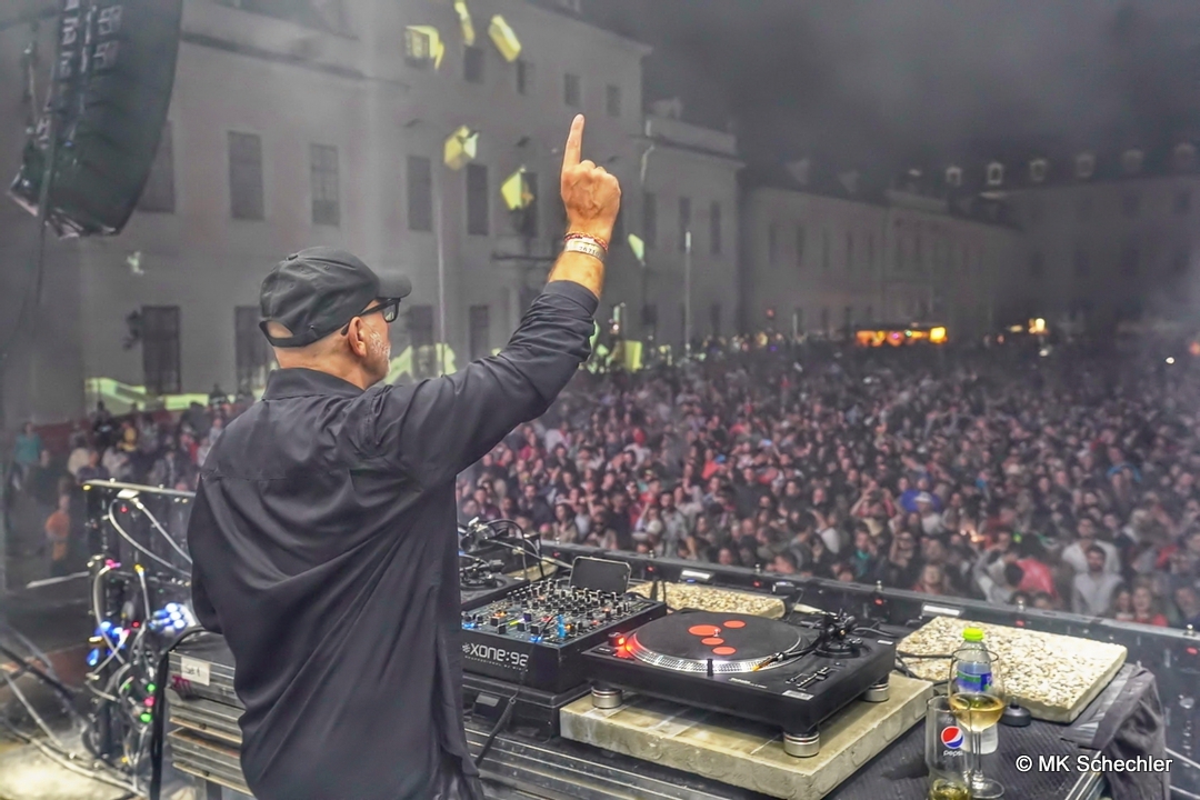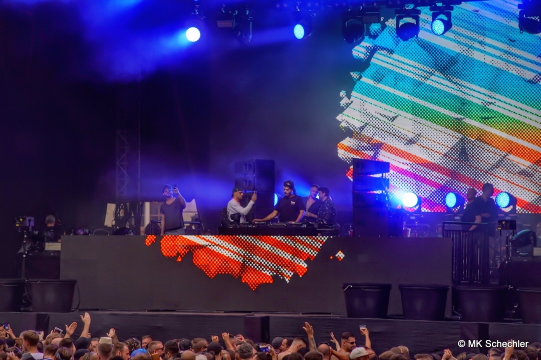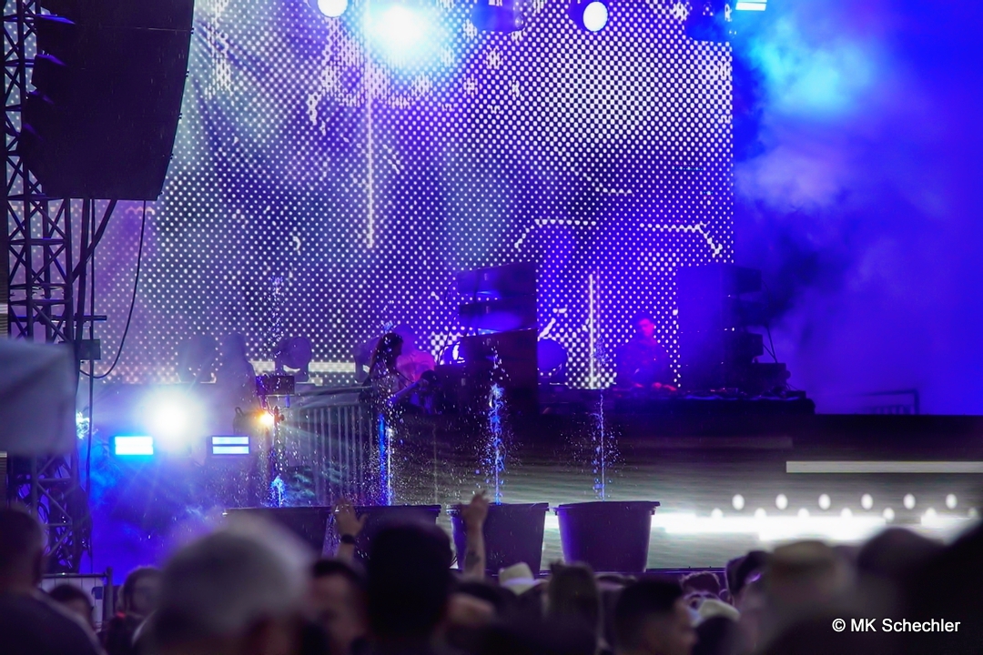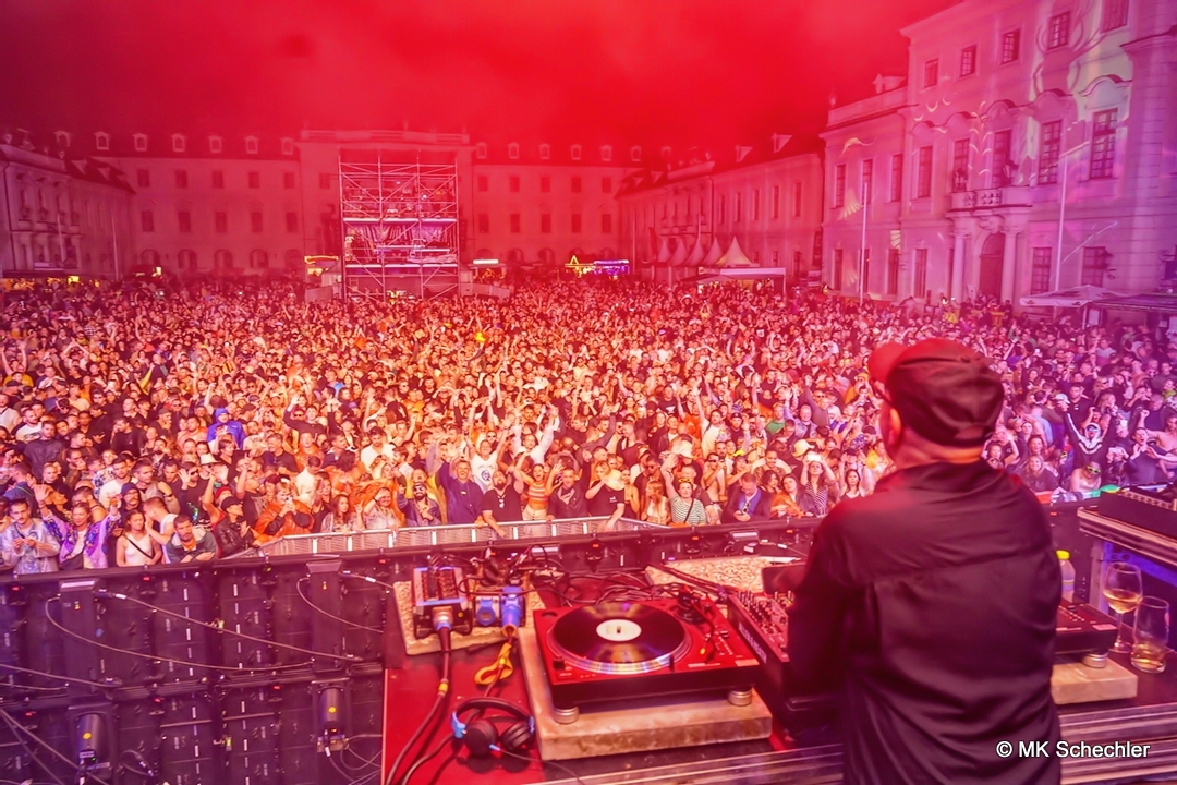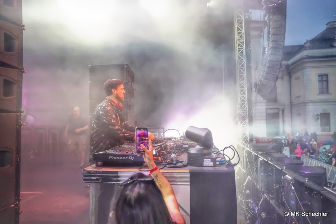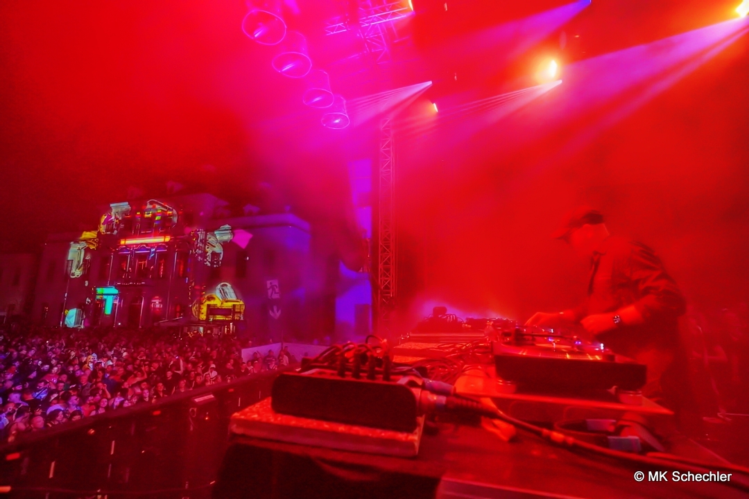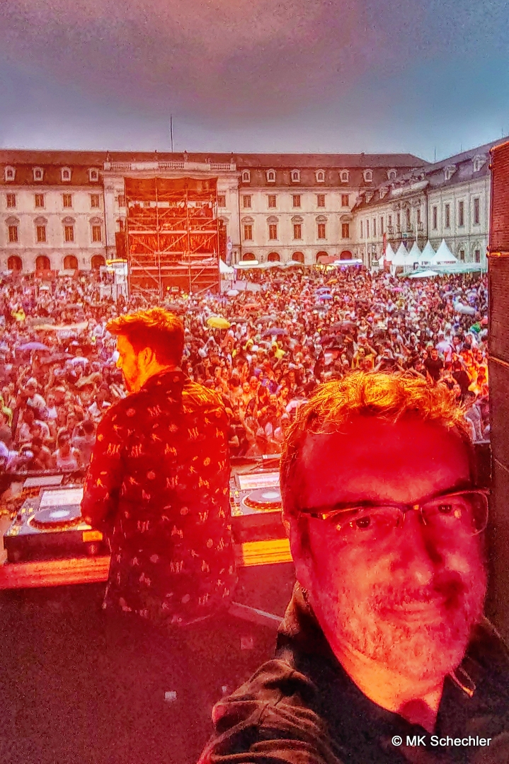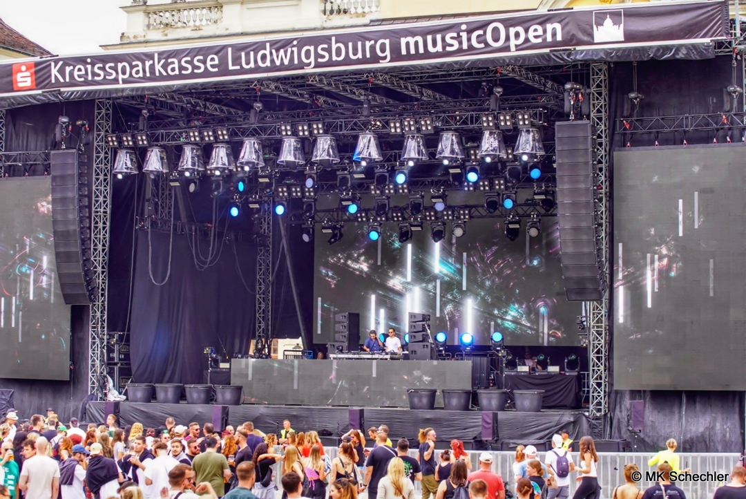 Gut acht Stunden reiht sich eine Show an die andere. Techno, House, Rave – bunt gemischt wie das Wetter an diesem Tag: von anhaltendem Regen bis Sonnenschein, alles war dabei. Sechs Shows von DJ-Acts und einer DJane reihen sich nahtlos aneinander und wurden bei zunehmender Dunkelheit von sehenswerten Laser-Projektionen ergänzt. Ein schöner Abschluss der diesjährigen KSK MusicOpen im Schlosshof des Residenzschlosses Ludwigsburg.