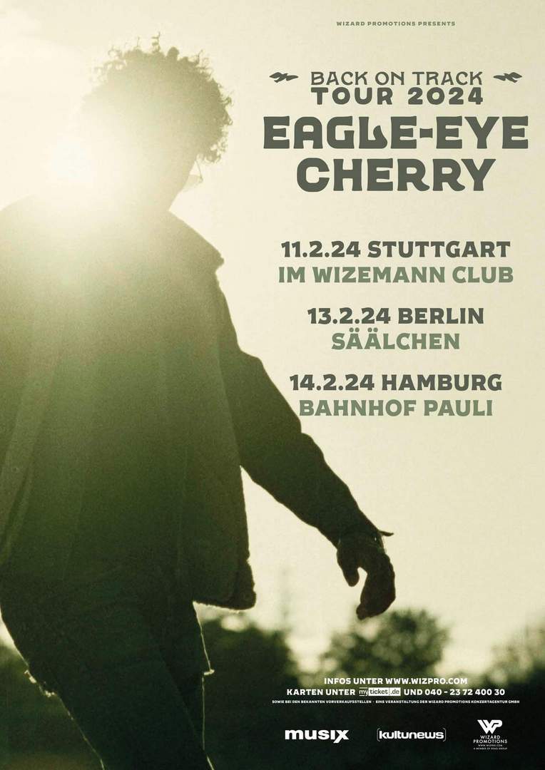 Eagle-Eye Cherry wurde in den späten 1990er Jahren mit seinem Debütalbum „Desireless“ berühmt, dass den Welthit „Save Tonight“ enthielt. Der schwedisch-amerikanische Alternative-Rock-Singer-Songwriter ist mit seinem neuen Album „Back on Track“ zurück. Eagle-Eye Cherry tritt in folgenden Städten auf: in Stuttgart am 11. Februar 2024 (Im Wizemann Club), in Berlin am 13. Februar 2024 (Säälchen) und in Hamburg am 14. Februar 2024 (Bahnhof Pauli).