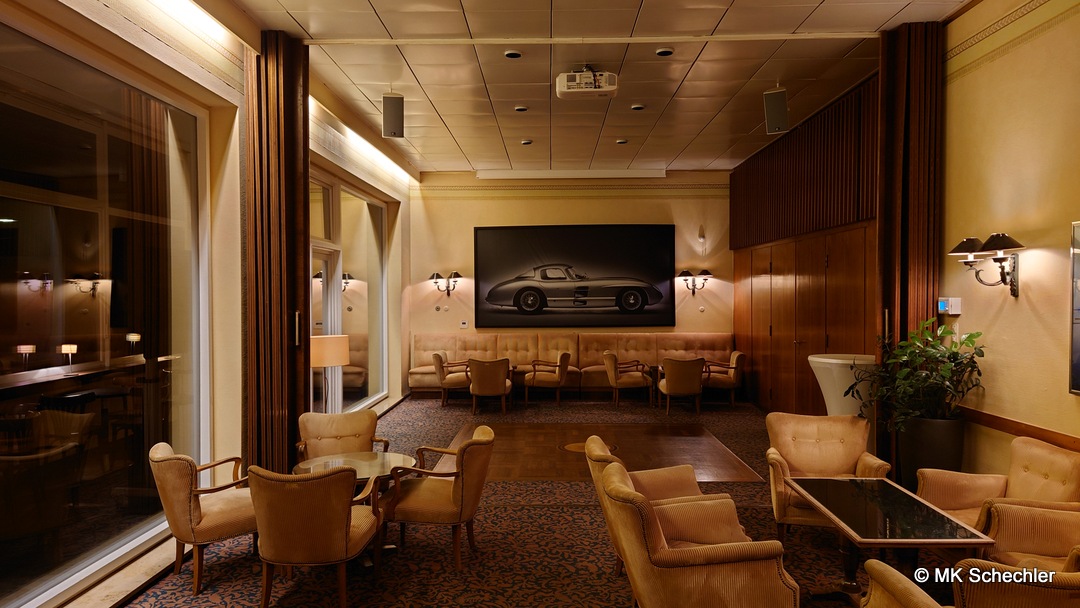 Robert-Bosch-Saal im WAC Clubgebäude in restauriertem Retro-Design mit Mercedes Benz 300 SLR – Das “UHLENHAUT COUPÉ” von 1955 fotografiert von René Staud