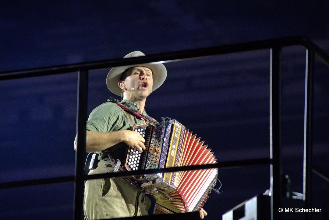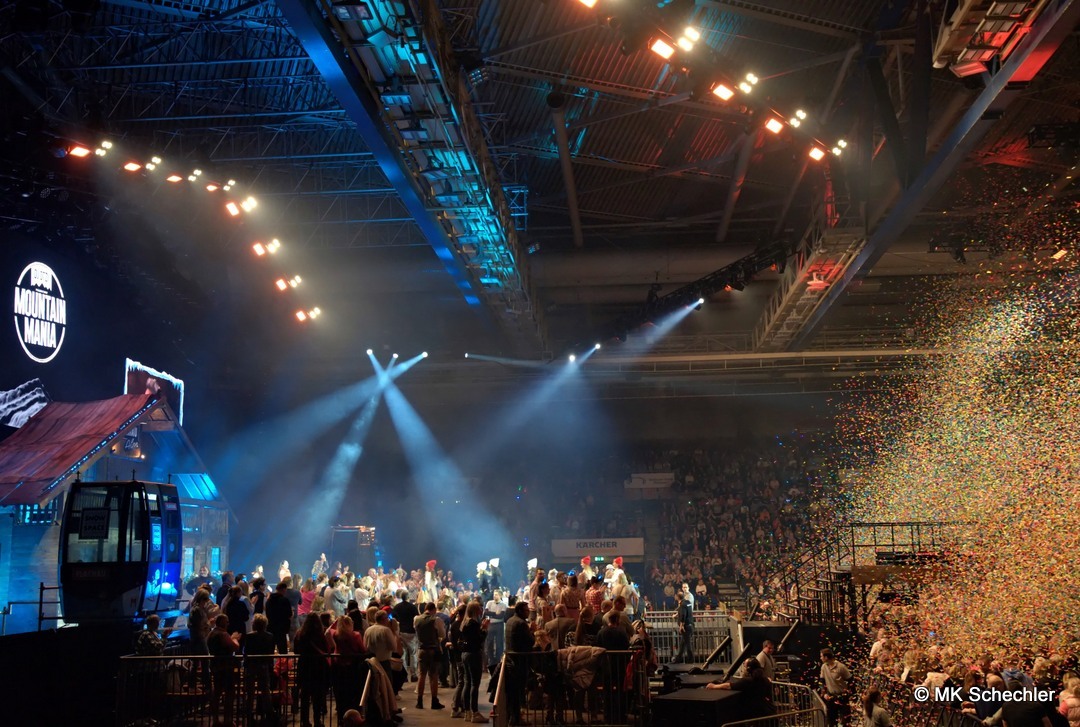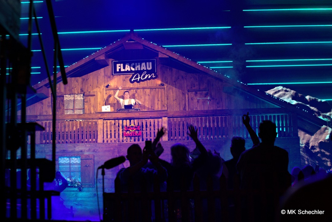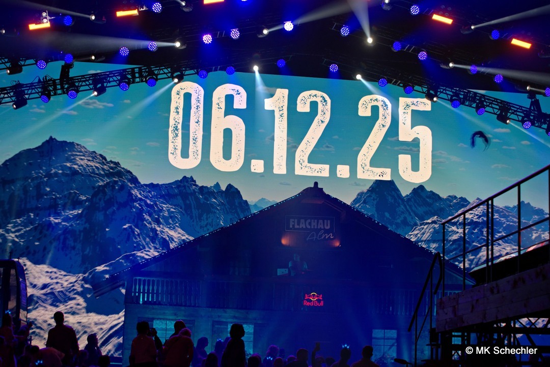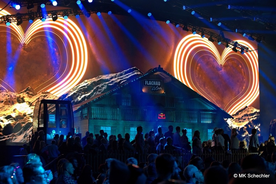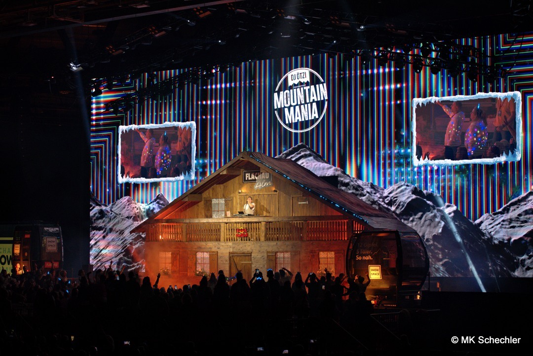 Schon beim Betreten der Halle wurde klar: „Mountain Mania“ ist keine gewöhnliche Veranstaltung. Die Bühne erstreckte sich nahezu über den gesamten Innenraum und bot ein winterliches Panorama, das direkt aus einem österreichischen Skigebiet hätte stammen können. Eine rustikale Alm-Hütte mit Außenterrasse für VIP-Gäste, flankiert von echten Gondeln aus dem Snow Space Flachau, bildete den Auftakt. Dahinter führte ein Fußgängersteg, der von Stehplätzen und einer Ski-Bar umrahmt wurde, zur zweiten Bühne im hinteren Bereich der Halle. Diese kreative Kulisse – kombiniert mit prall gefüllten Tribünen – sorgte schon vor Showbeginn für eine Atmosphäre wie auf einer Alpenparty.