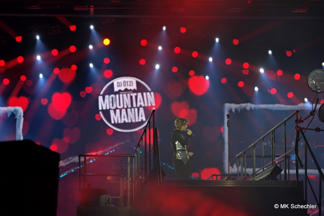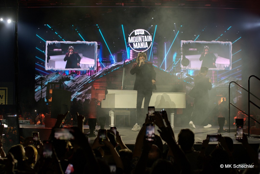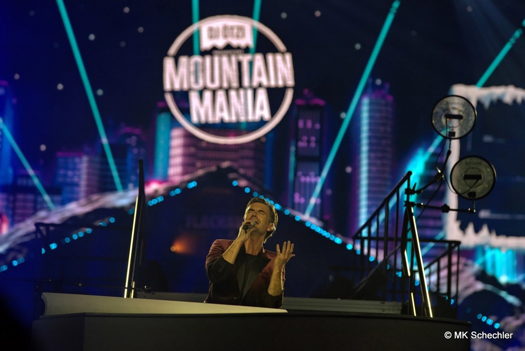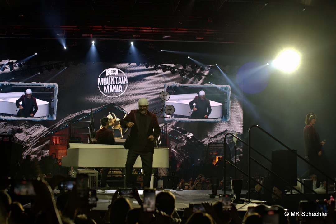 Mit der „Mountain Mania“-Titelmelodie als Auftakt betrat DJ Ötzi die Bühne und begrüßte die Menge mit einer energiegeladenen Version von „Let Me Entertain You“ – und das war keine leere Versprechung! Der Startschuss für eine Nacht voller Highlights fiel mit dem Auftritt von voXXclub, die mit ihrem modernen Alpenpop ordentlich einheizten. Dann trat „Jodel Toni“ auf, der nicht nur mit seinem Gesang, sondern auch mit einem kleinen Jodelkurs für Begeisterung sorgte. Matty Valentino brachte Party-Kracher im Stile von Après-Ski-Hits, bevor Anna-Maria Zimmermann mit ihrer Ballade „100.000 leuchtende Sterne“ die Handylichter in der Halle erstrahlen ließ. Unterstützt wurde die Show durch ein Feuerwerk aus Effekten: Konfettiregen, Nebelfontänen und künstlicher Schnee sorgten für stimmungsvolle Zwischenspiele.