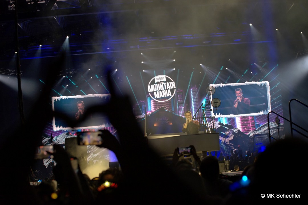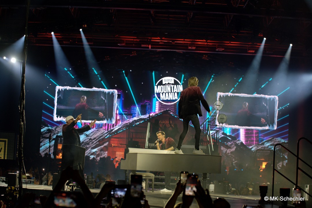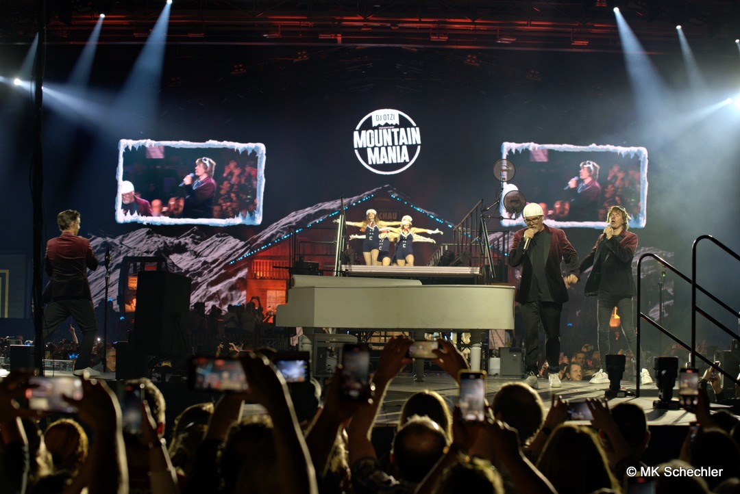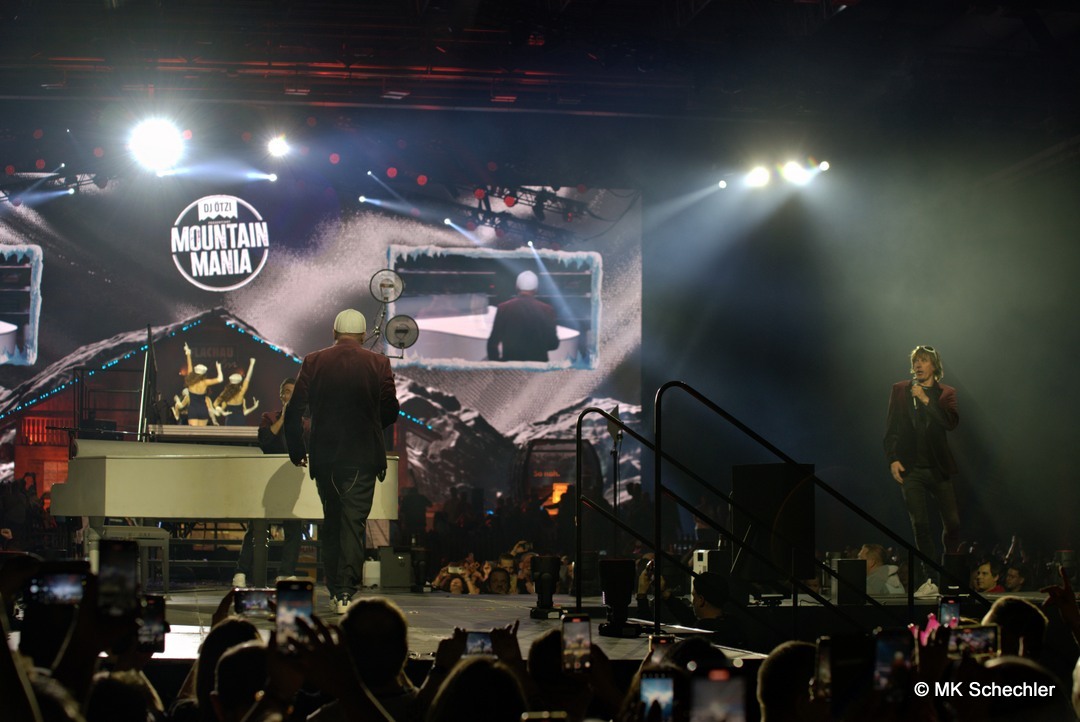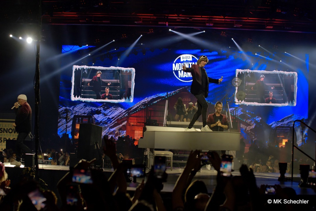 Mit der „Mountain Mania“-Titelmelodie als Auftakt betrat DJ Ötzi die Bühne und begrüßte die Menge mit einer energiegeladenen Version von „Let Me Entertain You“ – und das war keine leere Versprechung! Der Startschuss für eine Nacht voller Highlights fiel mit dem Auftritt von voXXclub, die mit ihrem modernen Alpenpop ordentlich einheizten. Dann trat „Jodel Toni“ auf, der nicht nur mit seinem Gesang, sondern auch mit einem kleinen Jodelkurs für Begeisterung sorgte. Matty Valentino brachte Party-Kracher im Stile von Après-Ski-Hits, bevor Anna-Maria Zimmermann mit ihrer Ballade „100.000 leuchtende Sterne“ die Handylichter in der Halle erstrahlen ließ. Unterstützt wurde die Show durch ein Feuerwerk aus Effekten: Konfettiregen, Nebelfontänen und künstlicher Schnee sorgten für stimmungsvolle Zwischenspiele.