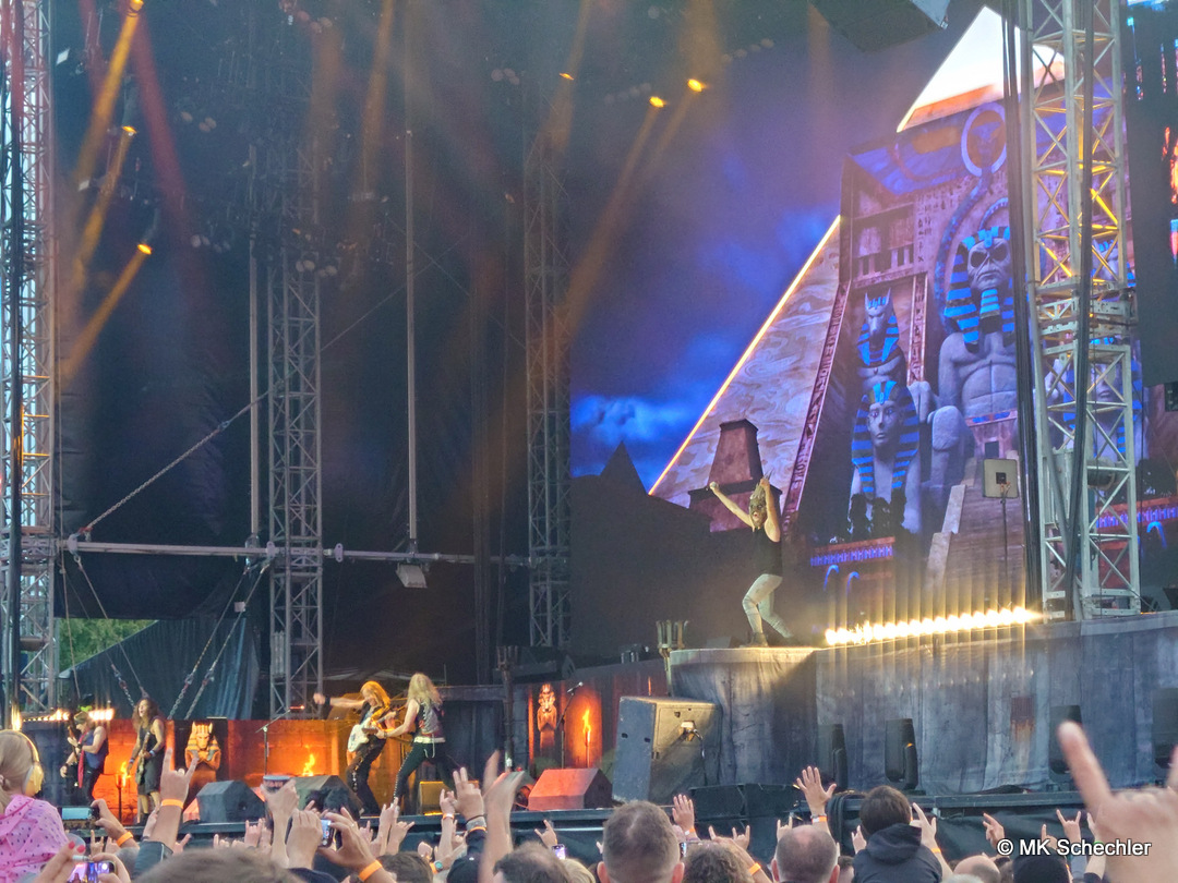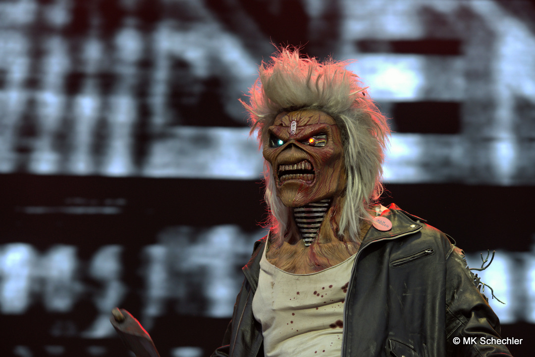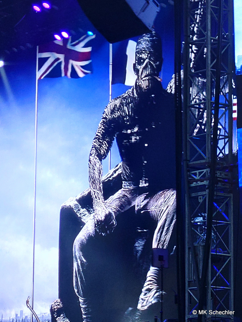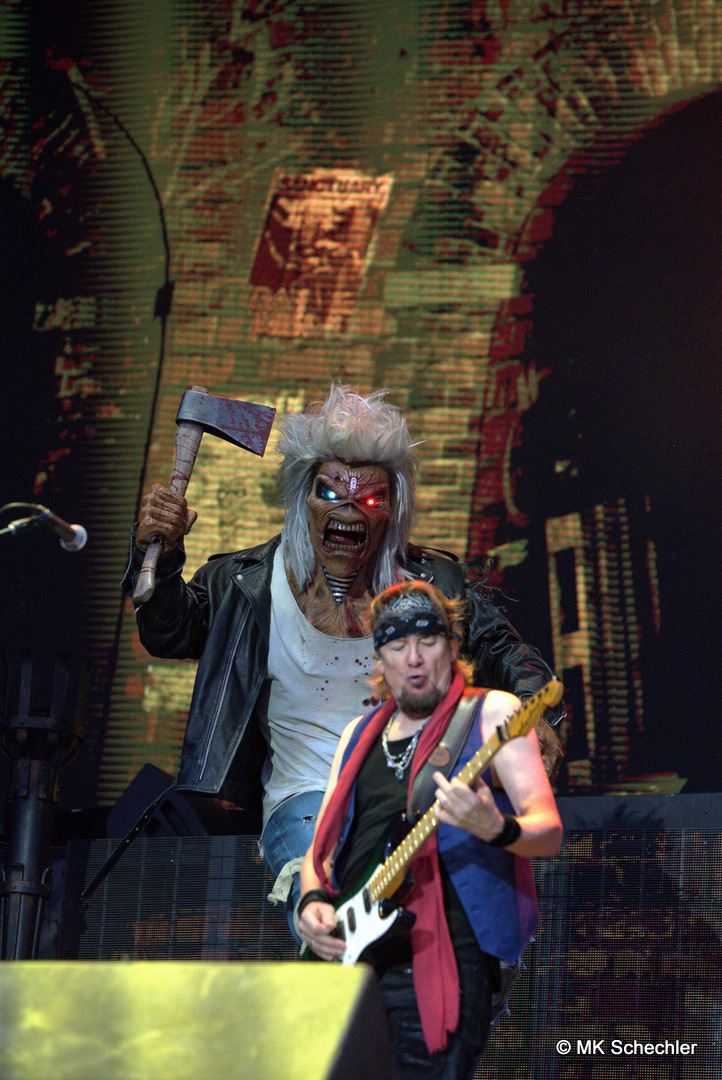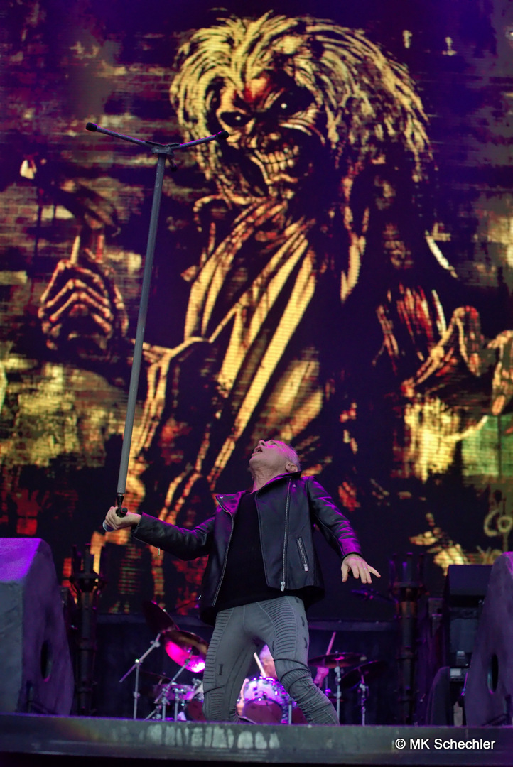 IRON MAIDEN sind nicht nur eine der langlebigsten Bands des Heavy Metal – sie sind eine Institution. Gegründet 1975 in London, trugen sie maßgeblich zur Definition des Genres bei. Frontmann Bruce Dickinson, seit 1981 (mit kurzer Unterbrechung) das stimmgewaltige Gesicht der Band, bewies einmal mehr, dass er mit seinen 66 Jahren nichts von seiner Bühnenpräsenz eingebüßt hat. Mit wehender Jacke, kraftvoller Stimme und britischem Charme führte er durch das Set, während Eddie – das ikonische Bandmaskottchen – mit Tomahawk über die Bühne stapfte.