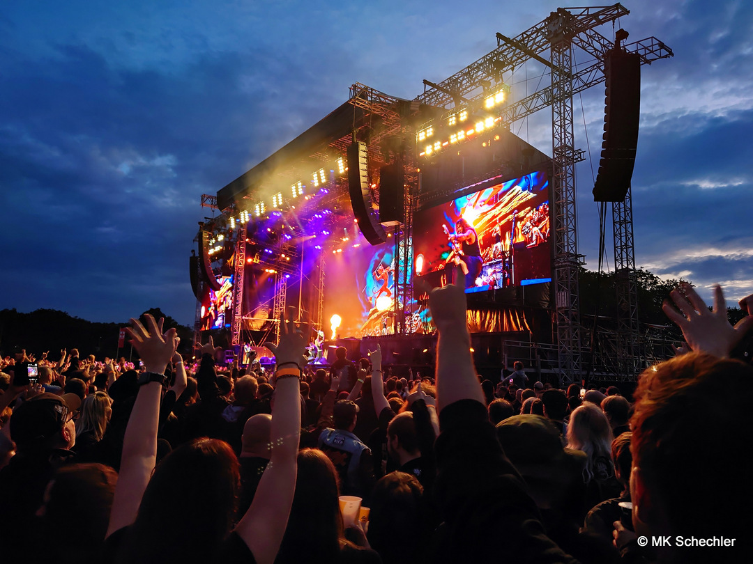 Stuttgart, Cannstatter Wasen, 45.000 euphorisierte Fans – das war die eindrucksvolle Kulisse für einen unvergesslichen Abend voller Energie, Nostalgie und Heavy-Metal-Magie. Die britischen Metal-Ikonen IRON MAIDEN machten im Rahmen ihrer „Run For Your Lives“-Tour Halt in der Landeshauptstadt, und lieferten eine Show, die weit mehr war als nur ein Konzert – es war ein Erlebnis, das noch lange in Erinnerung bleiben wird.