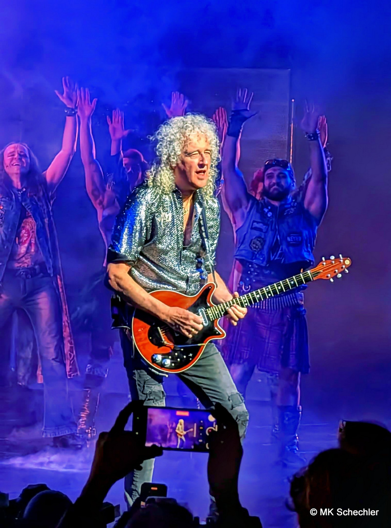 Dann der Moment, der niemanden im Saal kalt ließ: Sir Brian May, der legendäre Queen-Gitarrist, betritt unter tosendem Applaus die Bühne. Mit seiner ikonischen „Red Special“ in den Händen stimmt er “Bohemian Rhapsody” an – live, elektrisierend, magisch. Die Menge erhebt sich, das Theater bebt. Minutenlange Standing Ovations, Tränen in den Augen, pure Freude. Ein Moment, der sich in die Geschichte des Stage Palladium Theaters einbrennt.
