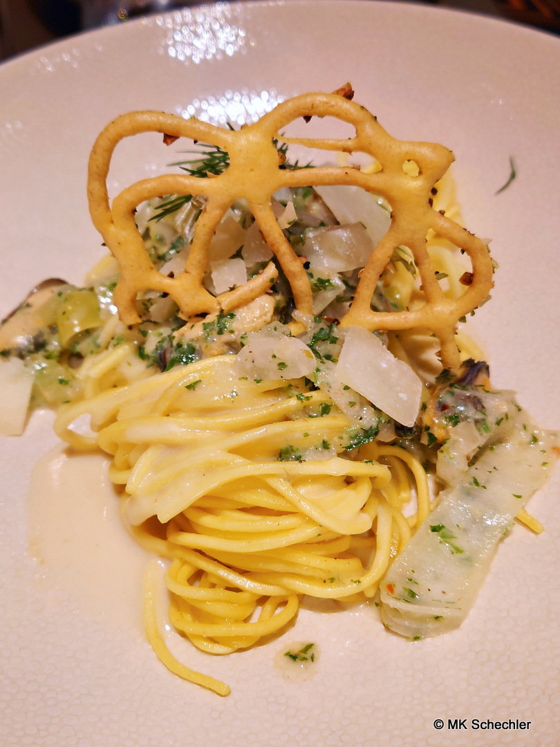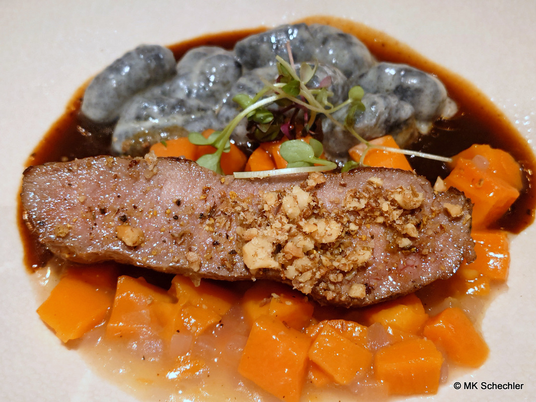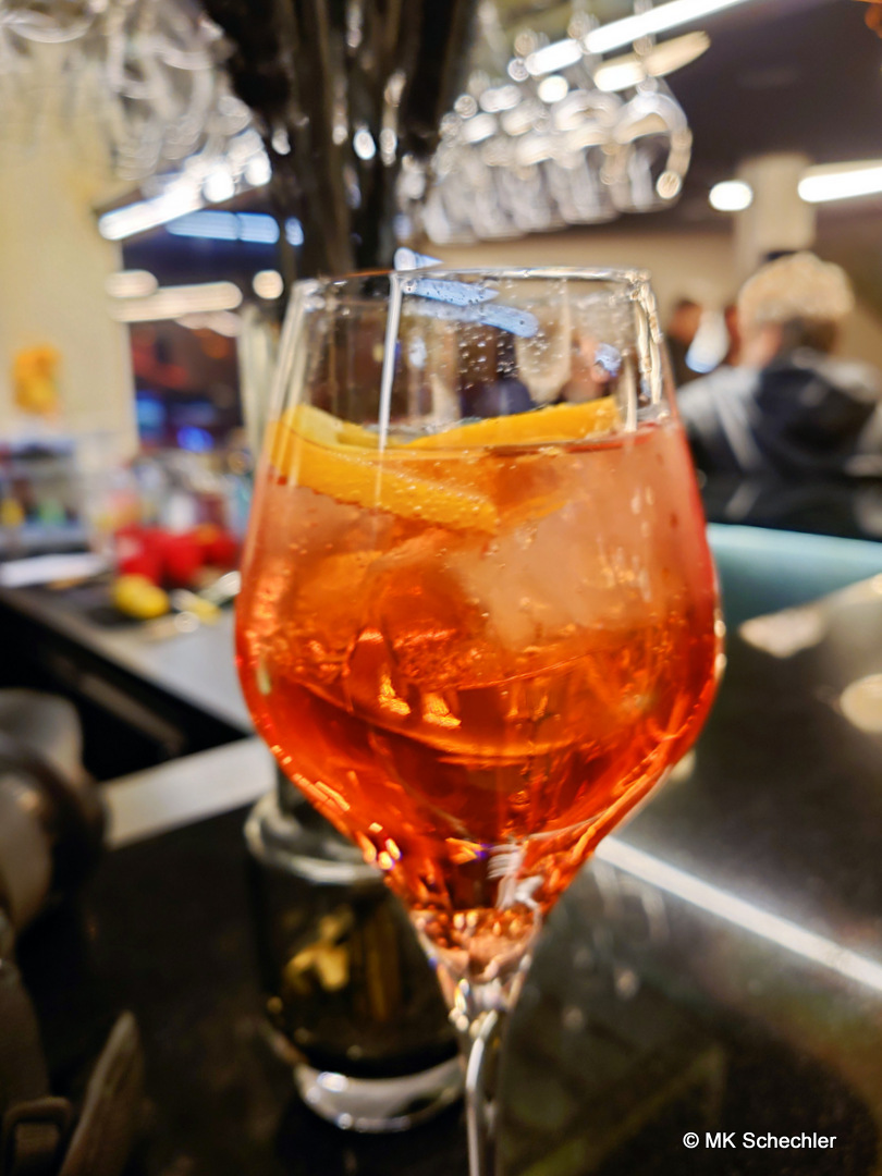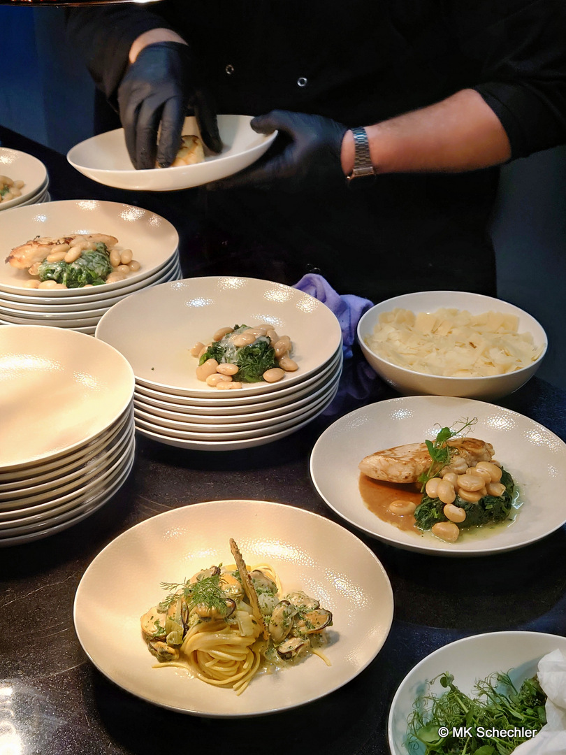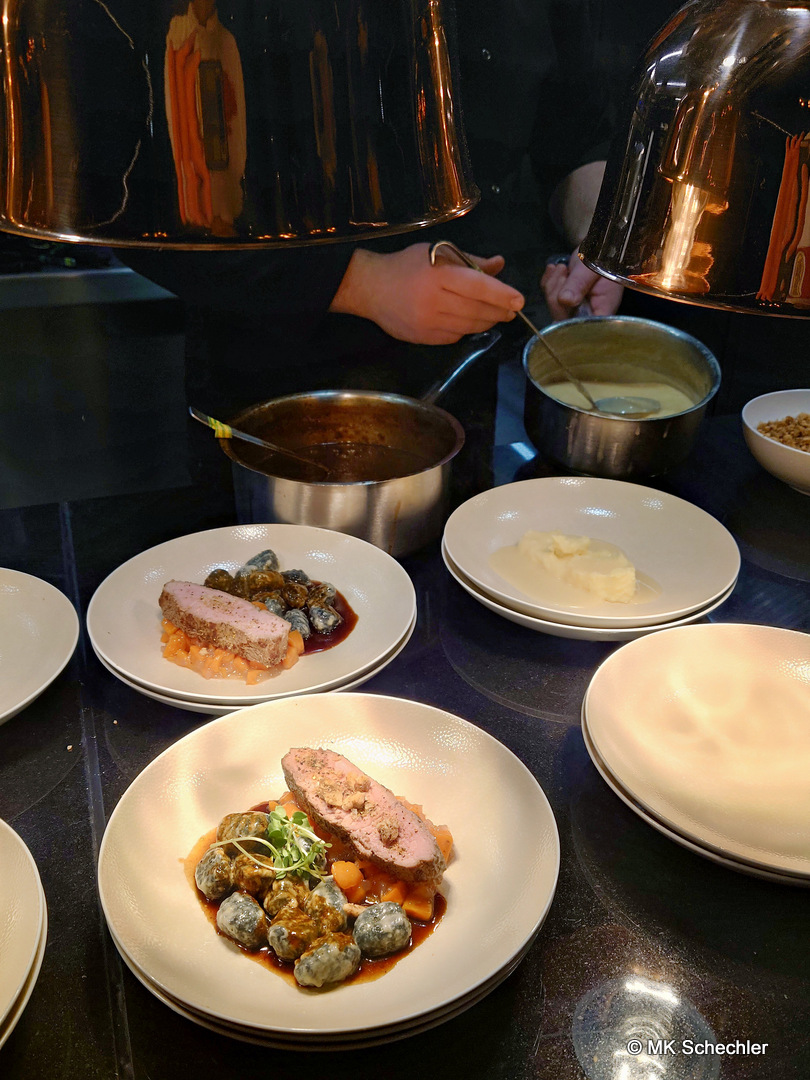 Im Tunnel Club selbst geht es einige Stufen tiefer – vorbei an der Targa-Bar, wo auf der Karte täglich wechselnde Cocktails angeboten werden. Nach einem Begrüßungssekt führt der Weg an den Tisch. Zur Auswahl stehen normale Tische, erhöhte Barhocker-Plätze oder gemütliche Nischen. Der Service ist aufmerksam und herzlich – Getränke und kleine Häppchen („Aufstellung“) stehen schnell bereit. Die Menüfolge ist charmant im Fußballjargon gehalten:
