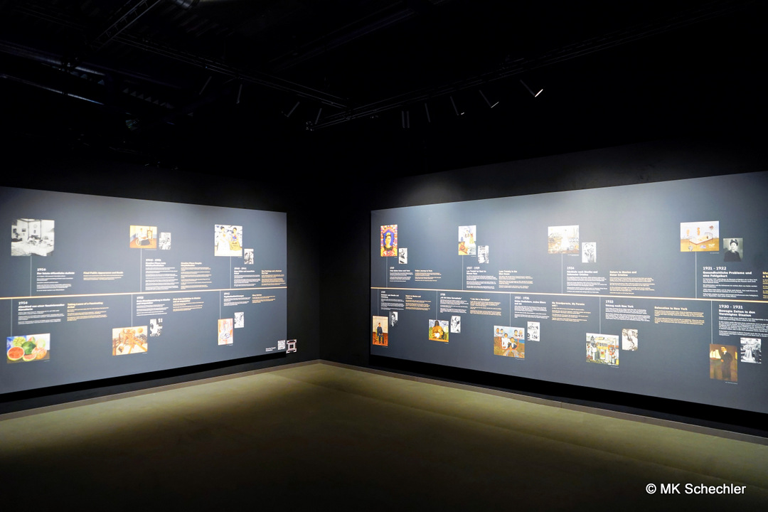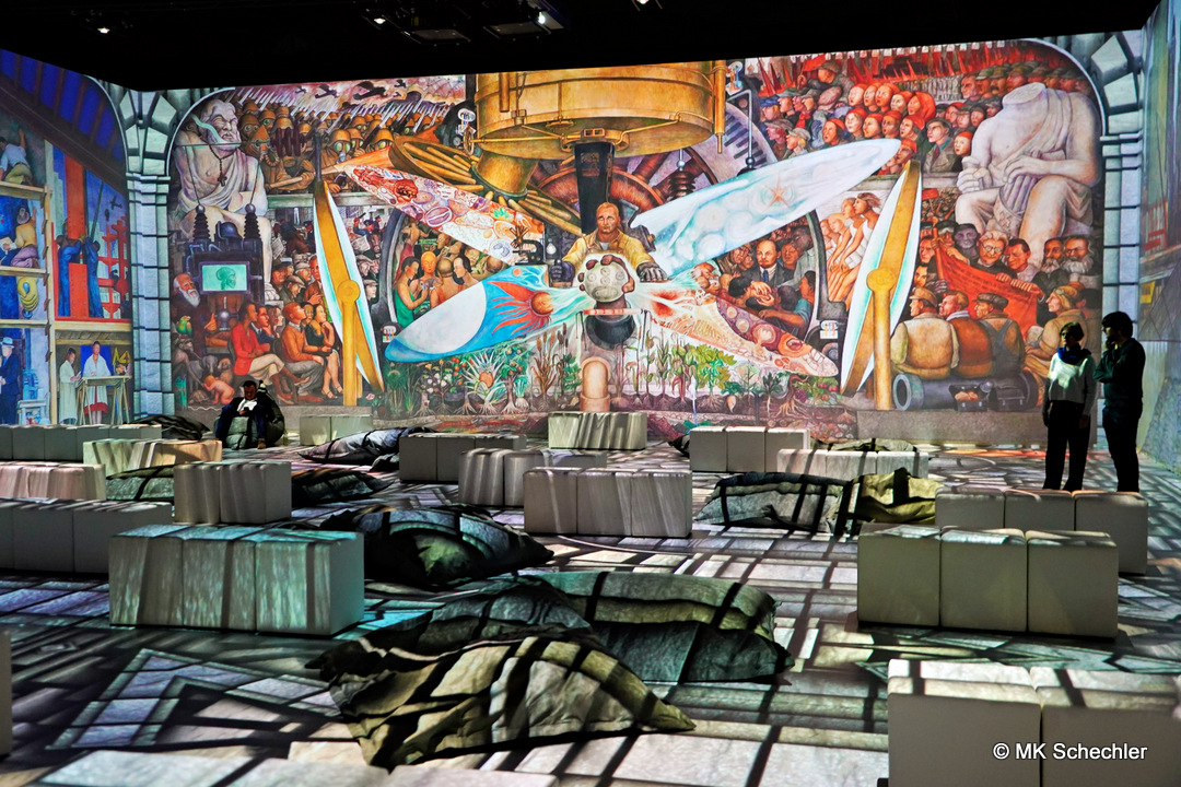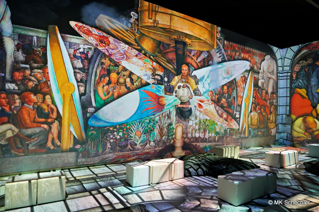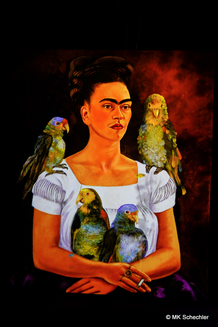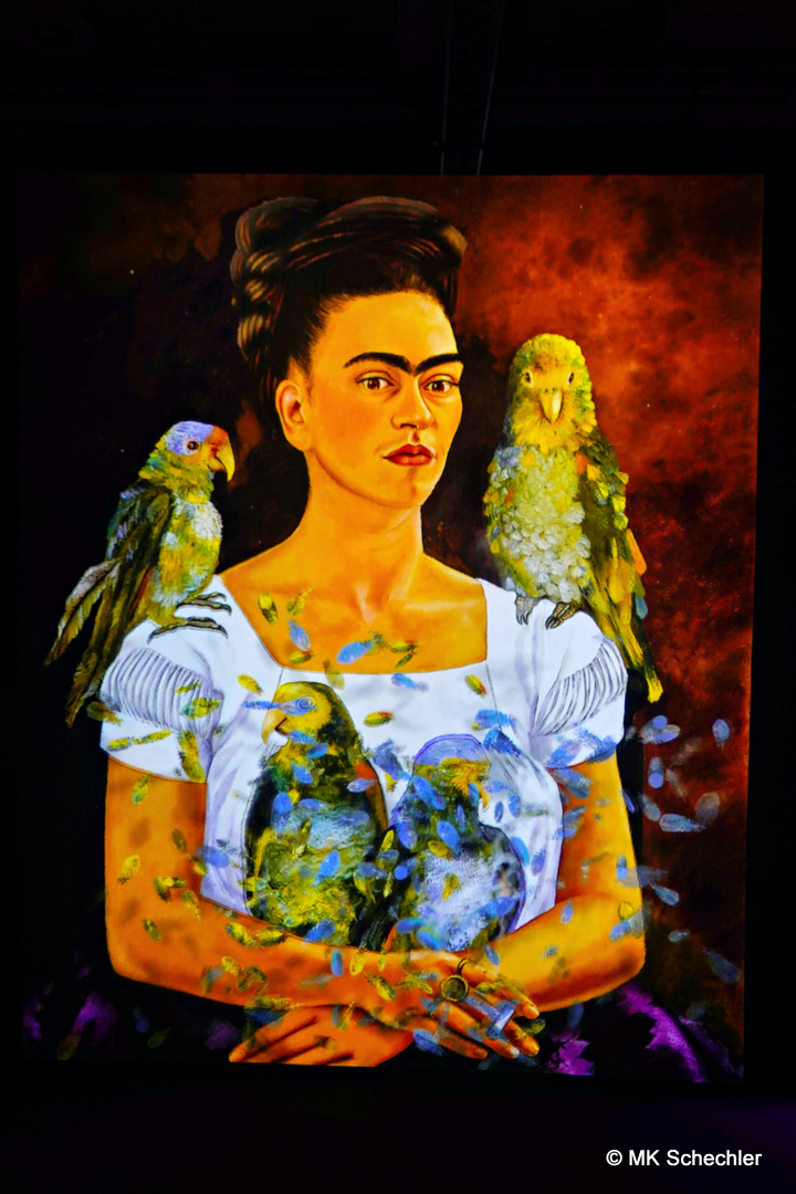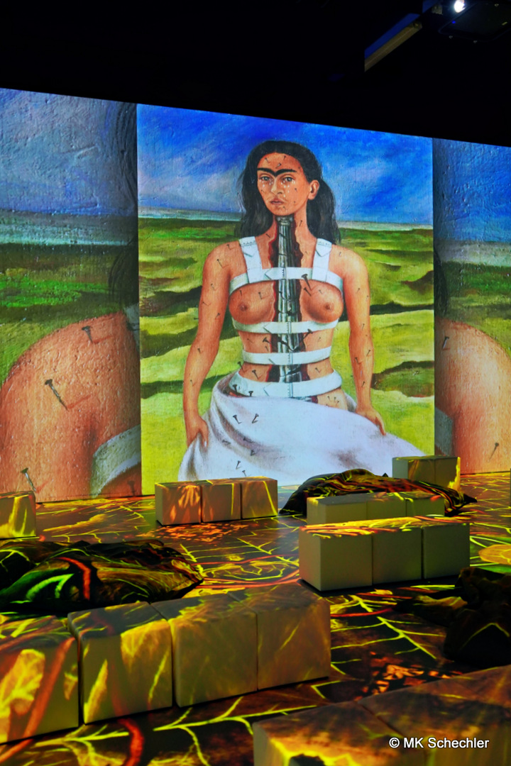 Das Herzstück der Ausstellung ist der große Showroom. Mit riesigen Rundumprojektionen werden die oft kleinformatigen Werke Kahlos auf bis zu zehn Meter Breite und über fünf Meter Höhe vergrößert. Die Wände und der Boden verwandeln sich in pulsierende Leinwände. Man steht mitten in Fridas Welt. Die stark erzählte Dramaturgie stützt sich auf ihre Tagebücher und führt durch die 1920er bis 40er Jahre. Die Besucherinnen und Besucher spüren den Mut, die Verletzlichkeit und den ungebrochenen Willen der Künstlerin, ihr Leben selbst zu definieren.