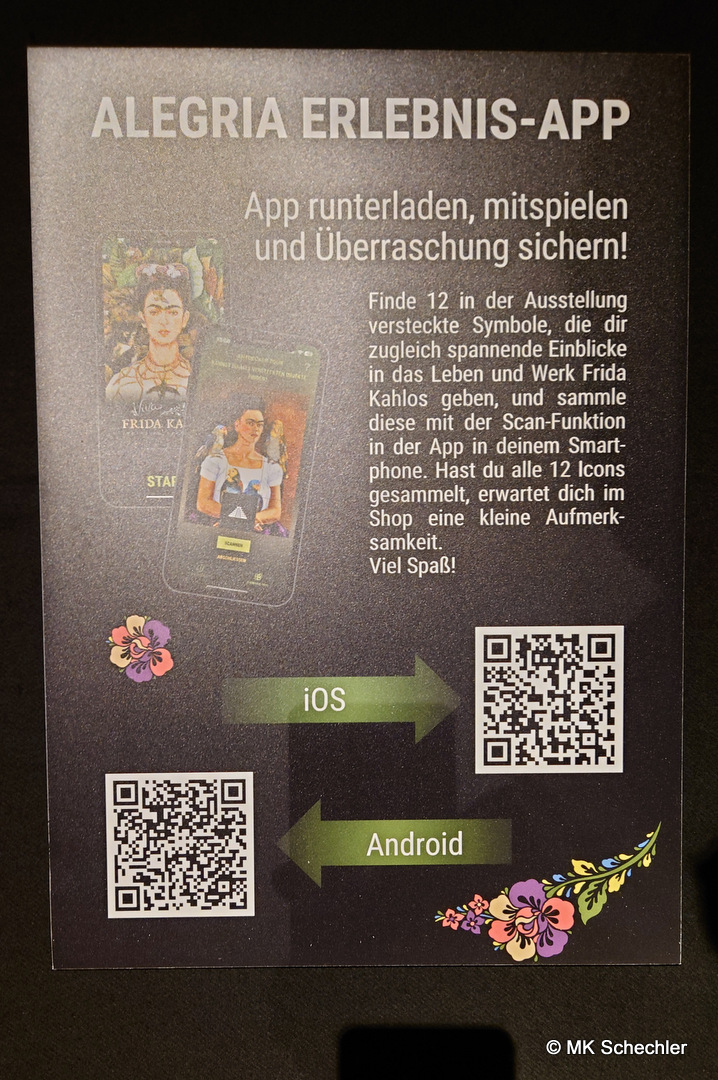 Bereits beim Eintreten öffnet sich die Tür zur Casa Azul, dem berühmten Zuhause der Künstlerin in Coyoacán. Die Besucherinnen und Besucher begleiten die junge Frida an den Moment zurück, der ihr Leben veränderte. Nach ihrem schweren Unfall begann sie vom Bett aus zu malen. Die Ausstellung greift diese intime Perspektive auf und führt Schritt für Schritt in die Gedankenwelt der Malerin. Dazu gehören Originalzitate, die eindringlich zeigen, wie viel Kraft sie aus der Kunst schöpfte.