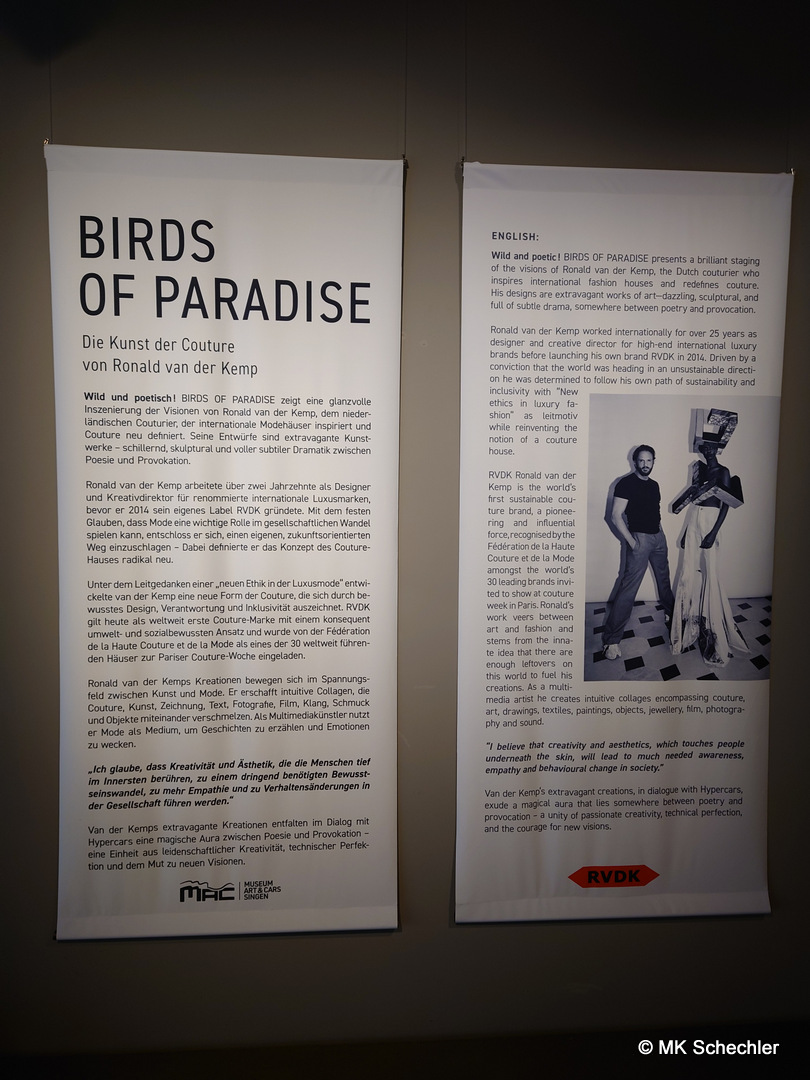 Wer glaubt, dass sich Mode, Kunst und automobile Hochleistung nur schwer unter einen Hut bringen lassen, sollte sich diese Ausstellung nicht entgehen lassen. Mit BIRDS OF PARADISE zeigt das MAC Museum Art & Cars (MAC1) in Singen eine ebenso sinnliche wie überraschende Inszenierung: die extravagante Couture des niederländischen Designers Ronald van der Kemp im Dialog mit ausgewählten Hypercars.