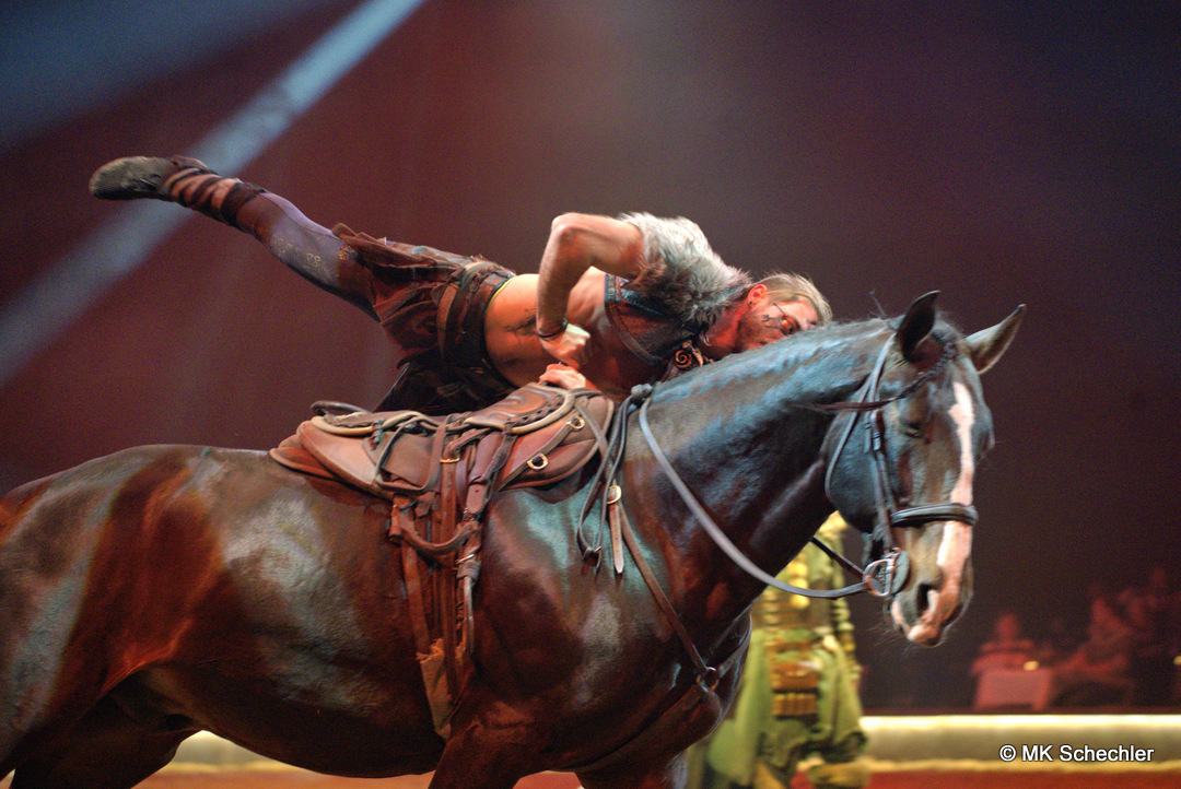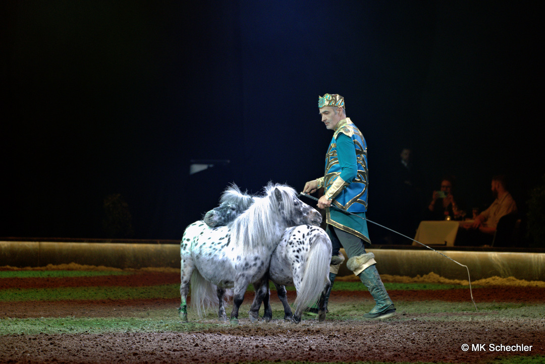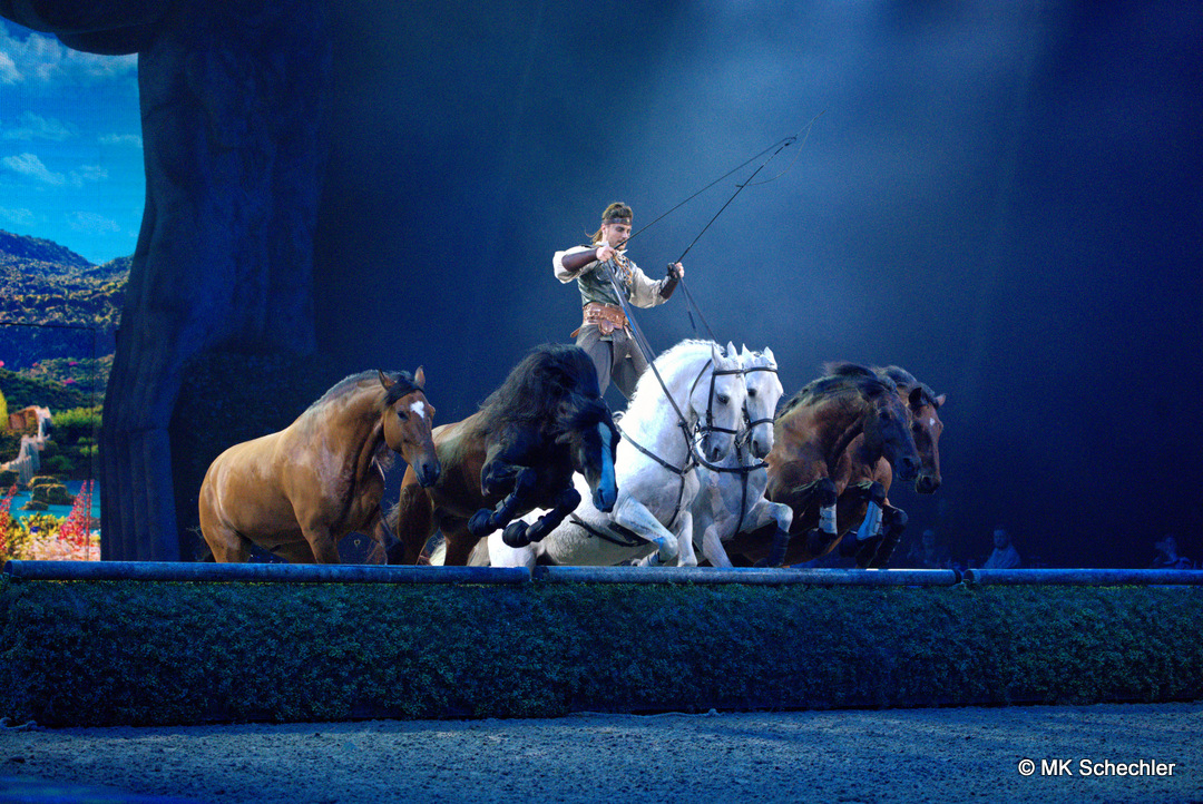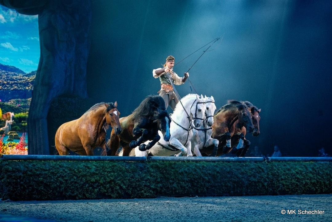 Die Geschichte wird mit eindrucksvollen Schaubildern erzählt, bei denen die Pferde die wahren Stars sind. Majestätische Friesen galoppieren kraftvoll über den Sand, elegante Lusitanos zeigen ihr Können in harmonischen Dressuren und niedliche Miniponys sorgen immer wieder für begeisterte Reaktionen im Publikum. Besonders spektakulär sind Szenen wie die rasante Ungarische Post oder waghalsige Trickreitnummern, bei denen Reiter und Pferde perfekt miteinander harmonieren. Ebenso berührend sind die ruhigen Momente der Freiheitsdressur, in denen sich die besondere Verbindung zwischen Mensch und Tier zeigt.